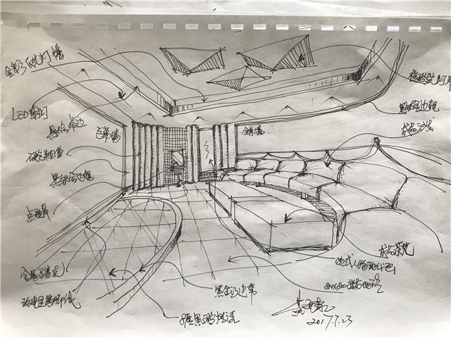 這是成都輝瑞大成設(shè)計(jì)總監(jiān)黃兩泉為云南威信錢柜KTV畫的臨時(shí)手繪圖,黃總監(jiān)擁有極強(qiáng)的藝術(shù)修養(yǎng),擅長(zhǎng)將藝術(shù)的審美經(jīng)驗(yàn),轉(zhuǎn)化成設(shè)計(jì)動(dòng)力。多年室內(nèi)設(shè)計(jì)領(lǐng)域探索經(jīng)驗(yàn),一直致力于東方傳統(tǒng)美學(xué)精神與當(dāng)代設(shè)計(jì)手法碰撞,帶領(lǐng)設(shè)計(jì)團(tuán)隊(duì)開拓多元化的設(shè)計(jì)實(shí)現(xiàn)。你可撥打電話預(yù)約設(shè)計(jì):136-5805-6661,可免費(fèi)平面設(shè)計(jì)和初步預(yù)算報(bào)價(jià)。 好的手繪圖可以反應(yīng)一個(gè)設(shè)計(jì)師的素養(yǎng),這個(gè)項(xiàng)目1000平方,黃總監(jiān)手繪圖快速直觀的反應(yīng)KTV設(shè)計(jì)造型結(jié)構(gòu),也是希望給客戶呈現(xiàn)更好的效果,后期還要加工處理畫出3D效果圖,請(qǐng)盡情期待吧!