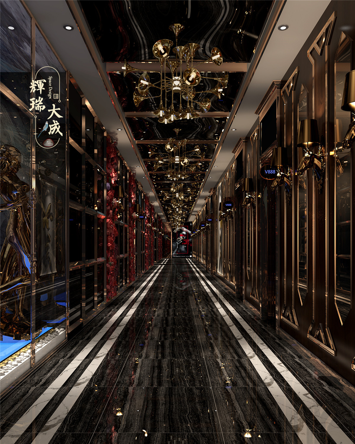 大廳滿天吸音星空頂面層為聚酯吸音板,內層為聚酯吸音棉。地面水刀拼花,收銀服務臺大理石鑲嵌燈帶,螺旋狀不銹鋼造型懸空在服務臺上,大氣自然。頂部不規(guī)則不銹鋼拼接造型更顯富貴彰顯身份。