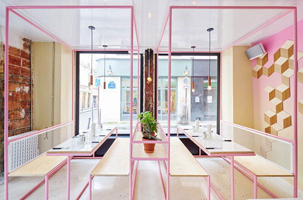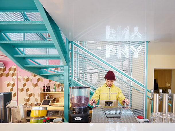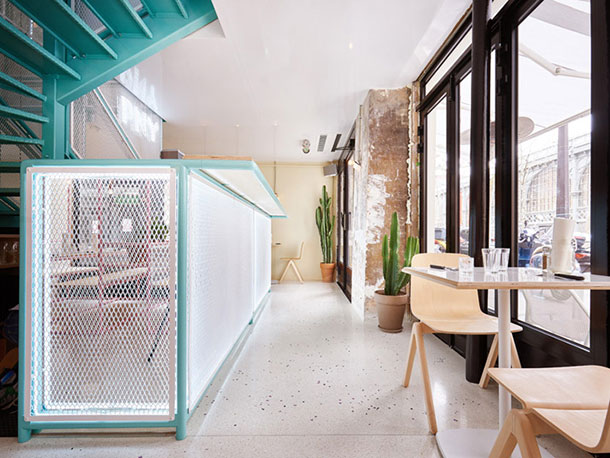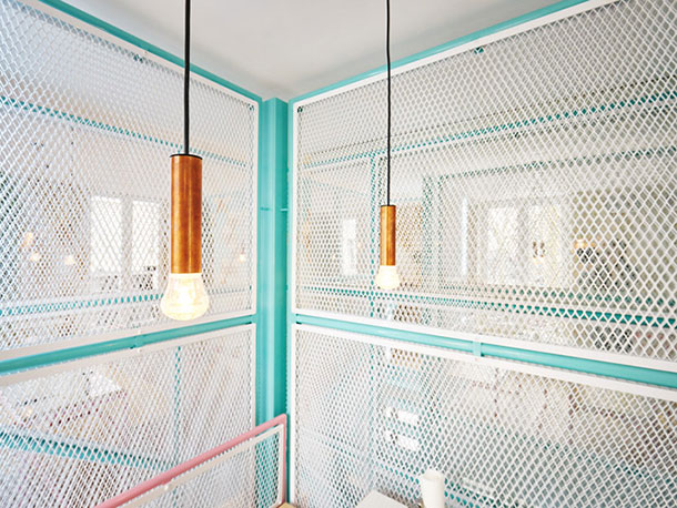 不算太大的用餐空間內(nèi),淡淡的熒光粉和薄荷綠色管道像是建筑空間的內(nèi)部結(jié)構(gòu)線,又像是一筆畫,自然而然勾勒出整個空間和桌椅的框架,大片的白色的金屬網(wǎng)格的運用既是巧妙的視覺設(shè)計又準確分割開來不同的功能空間!裸露的磚墻和水磨石的一樓地面為過于平滑輕盈的空間增加了一些現(xiàn)實感.