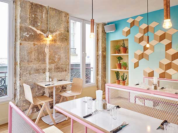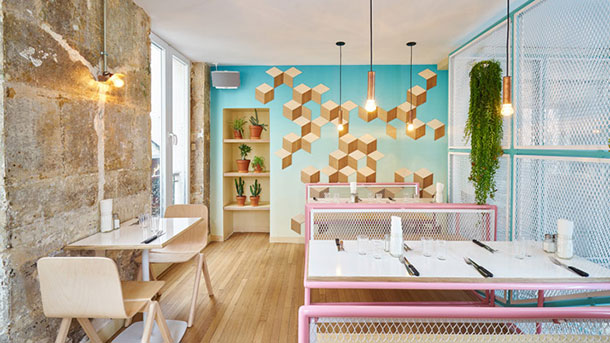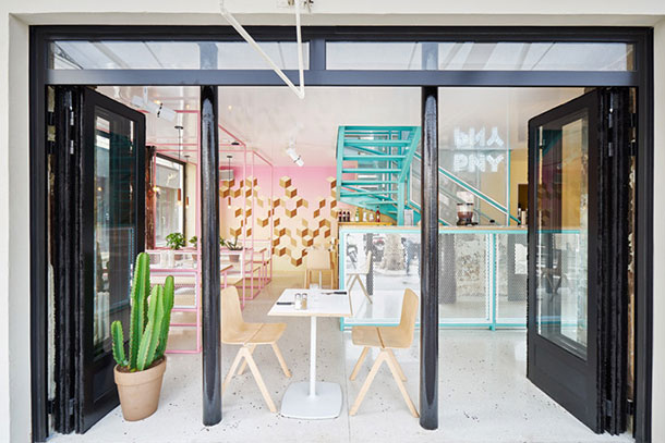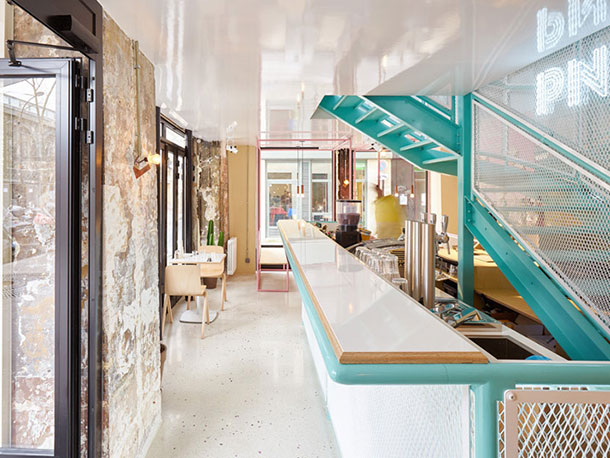 位于瑪黑區(qū)的 PNY是Paris New York漢堡連鎖店在巴黎開設(shè)的第三家分店,由巴黎在地的建筑室內(nèi)設(shè)計工作室CUT Architectures 設(shè)計,約莫是受到心向往之的邁阿密的啟發(fā),在白天的椰林樹影海風和煦與夜晚的華燈璀璨五光十色的影響下誕生了融合美式海濱小屋式快餐店風格的超現(xiàn)實主義室內(nèi)效果。