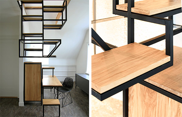 荷蘭設(shè)計(jì)師Mieke Meijer打造了一個(gè)具有儲物功能的樓梯。這個(gè)樓梯分兩個(gè)部分,上部高低兩排的懸浮鏤空結(jié)構(gòu)使其在具備儲物功能的同時(shí)也方便行走,而下部由儲物柜和辦公桌組成。這樣的設(shè)計(jì)方式在考慮樓梯自身功能的同時(shí),也有效的利用了空間。