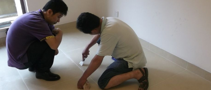 ③瓷磚要鑲平,角度要準(zhǔn)確,接口要對(duì)線(xiàn),廁所地面要有斜面,不可積水,瓷磚接口掃白水泥后要用藤絲刷凈白水泥,不可在上面留污漬;